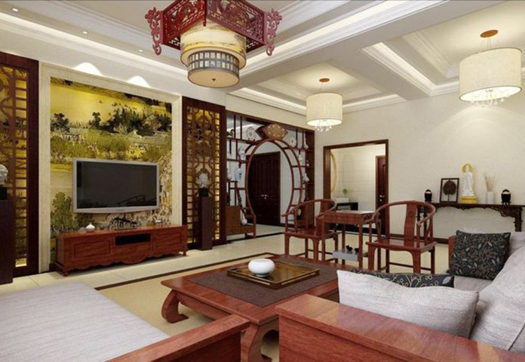 Самой главной затратной частью здесь стали резные зонирующие перегородки из натурального дерева или МДФ. Они отделяют большую комнату от прихожей и сразу создают стиль. Низкий столик с пуфами как будто сразу приглашает к чаепитию, а современный диван — к комфортному отдыху. Это прекрасный пример гибрида китайской культуры с настоящим временем, без вычурности и театральности, готового к обычной практичной жизни.