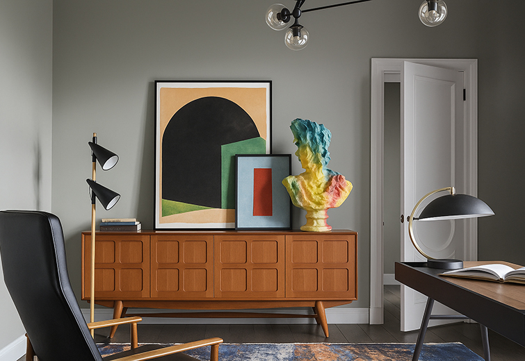 - Декор: постеры, абстрактные скульптуры, графические принты, фото и картины без рам, нестандартные зеркала, элементы поп-арта. Допускаются «безделушки» в виде коллекций на полках.