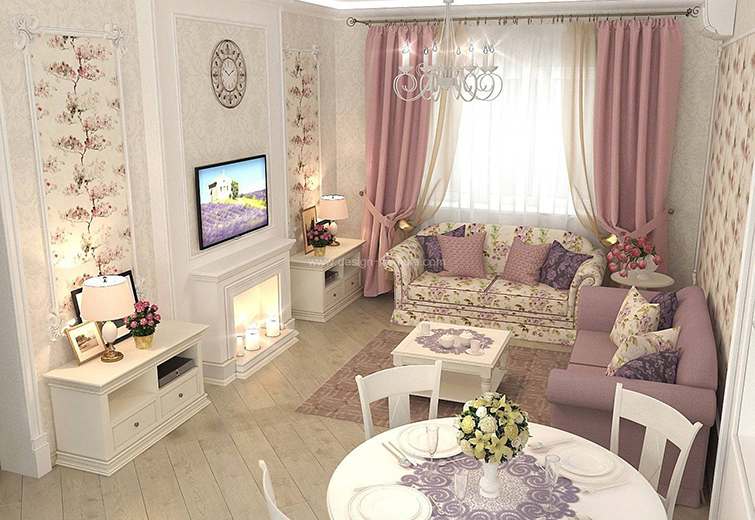 Типовая гостиная оклеивается простыми бумажными обоями. На полы укладывается ламинированная доска и на этом ремонтные работы закончены. Принадлежность к стилю создает мебель. Она изящна, выполнена из натурального массива, имеет характерный цвет. Есть все, что делает интерьер французским: цветы, декор, декоративный текстиль.