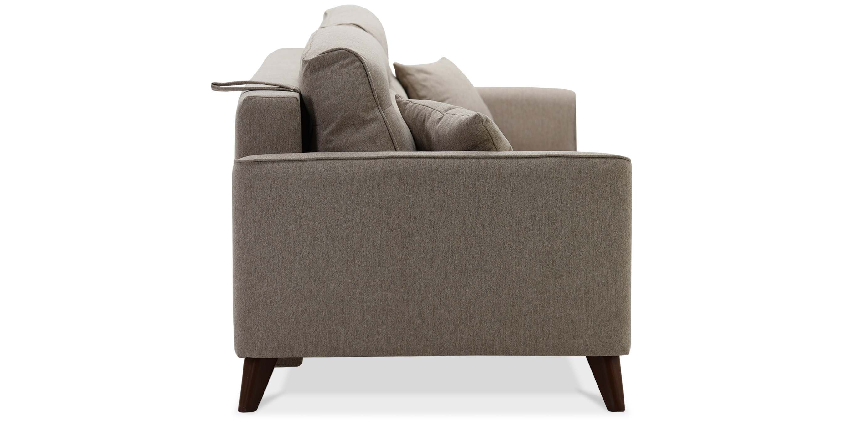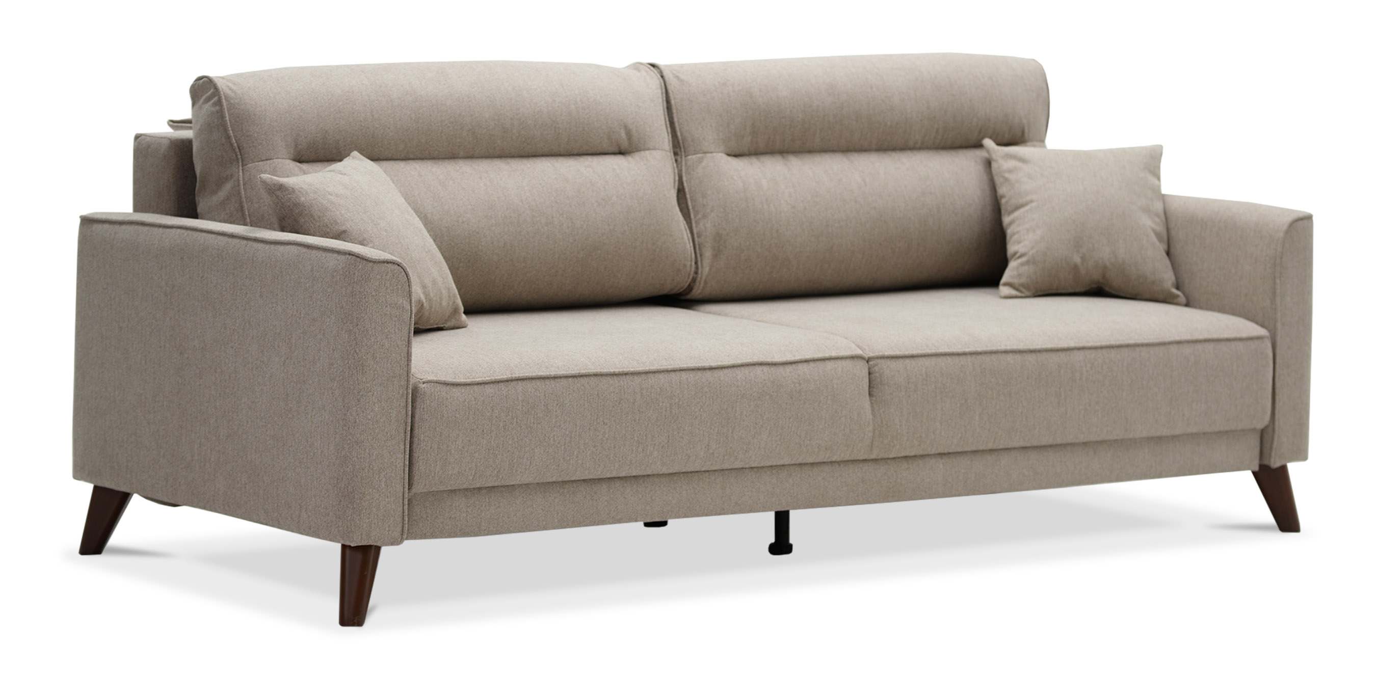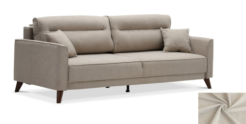- Диван декорирован опорами из пластика с покрытием под текстуру древесины (орех) высотой 14 см. Высокие опоры визуально облегчают конструкцию дивана и открывают доступ к уборке пространства под ним.
