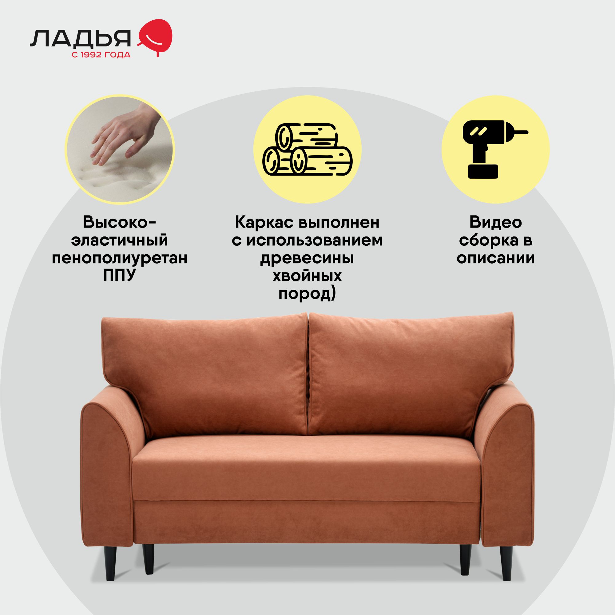 Каркас дивана выполнен с использованием древесины хвойных пород, ЛДСП, ДСП, фанеры.