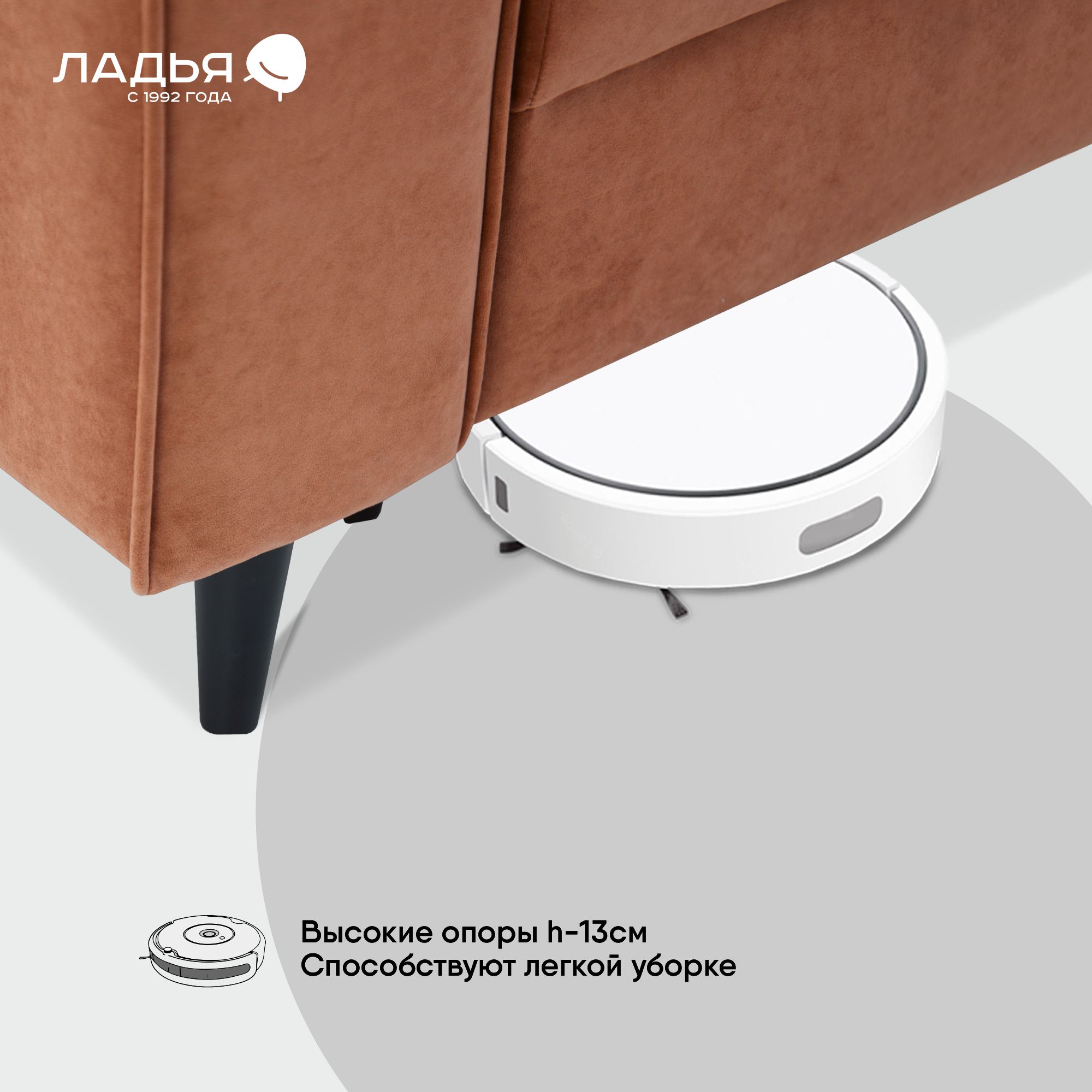 Опоры дивана выполнены из массива натурального дерева с лакокрасочным покрытием. Благодаря высоким опорам Вы с легкостью сможете провести уборку.