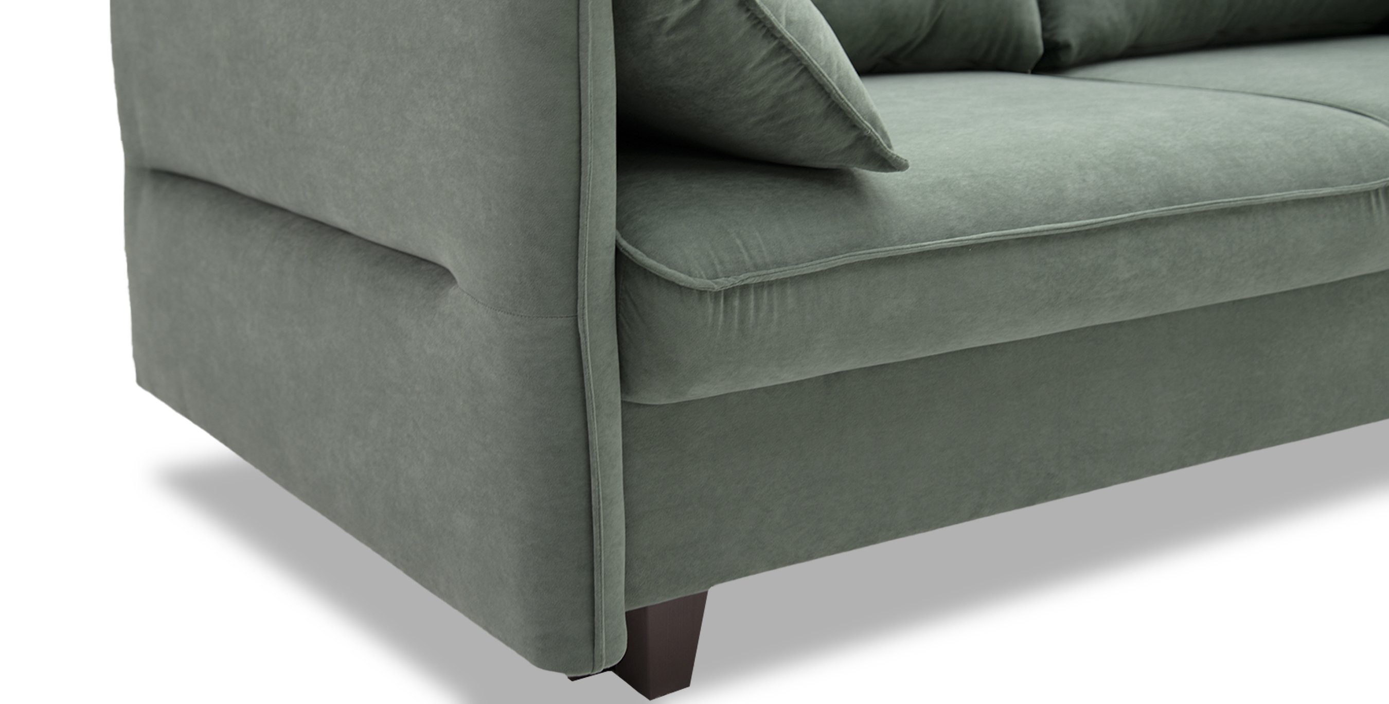 ✔ Диван декорирован опорами из пластика с покрытием под текстуру древесины высотой 9 см. Высокие опоры визуально облегчают конструкцию дивана и открывают доступ к уборке пространства под ним.