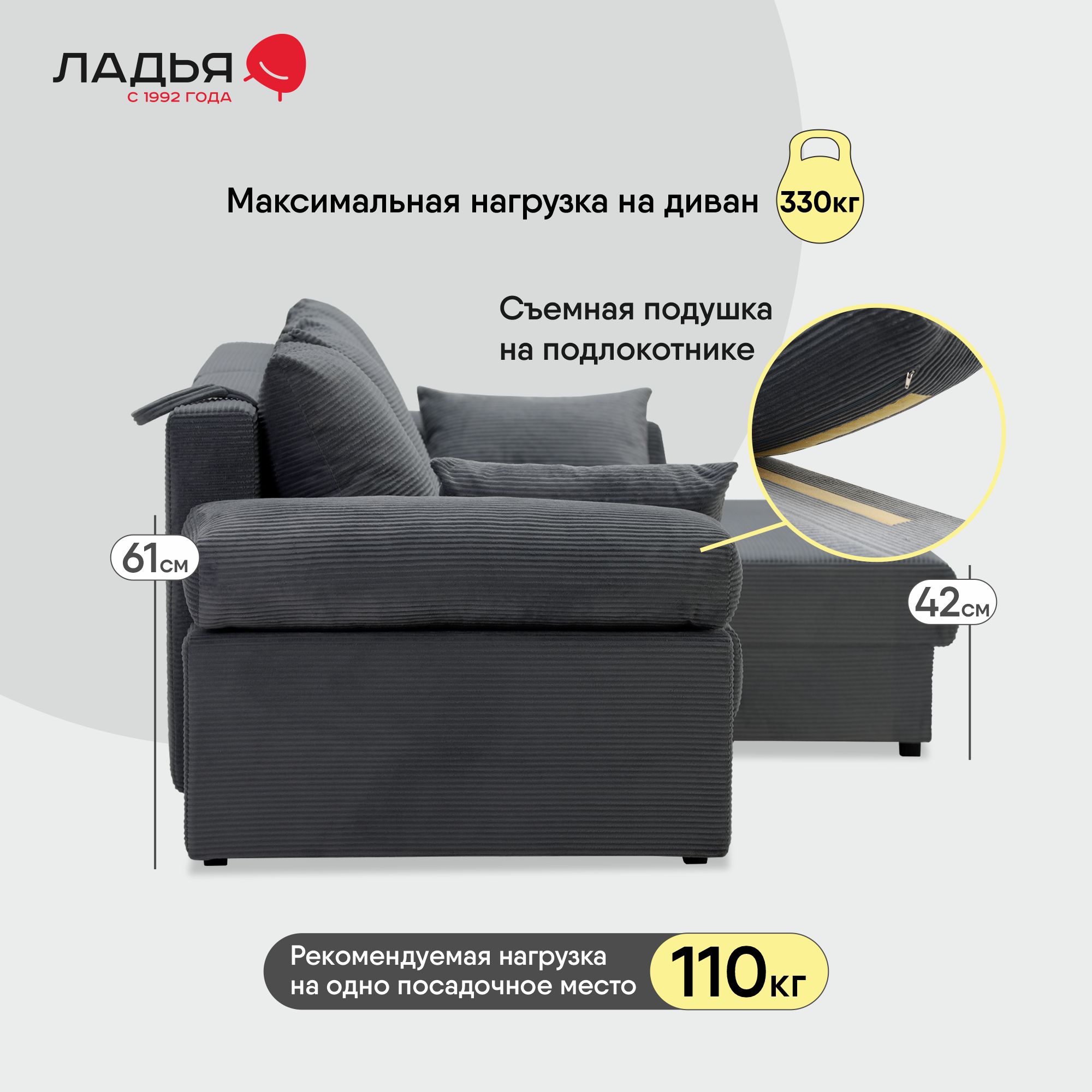 Высота сиденья - 42 см, глубина сиденья с подушкой - 63/117 см, без подушки - 87/142 см. Высота опор 3,5 см. Нагрузка на 1 посадочное (спальное) место 100 кг.
