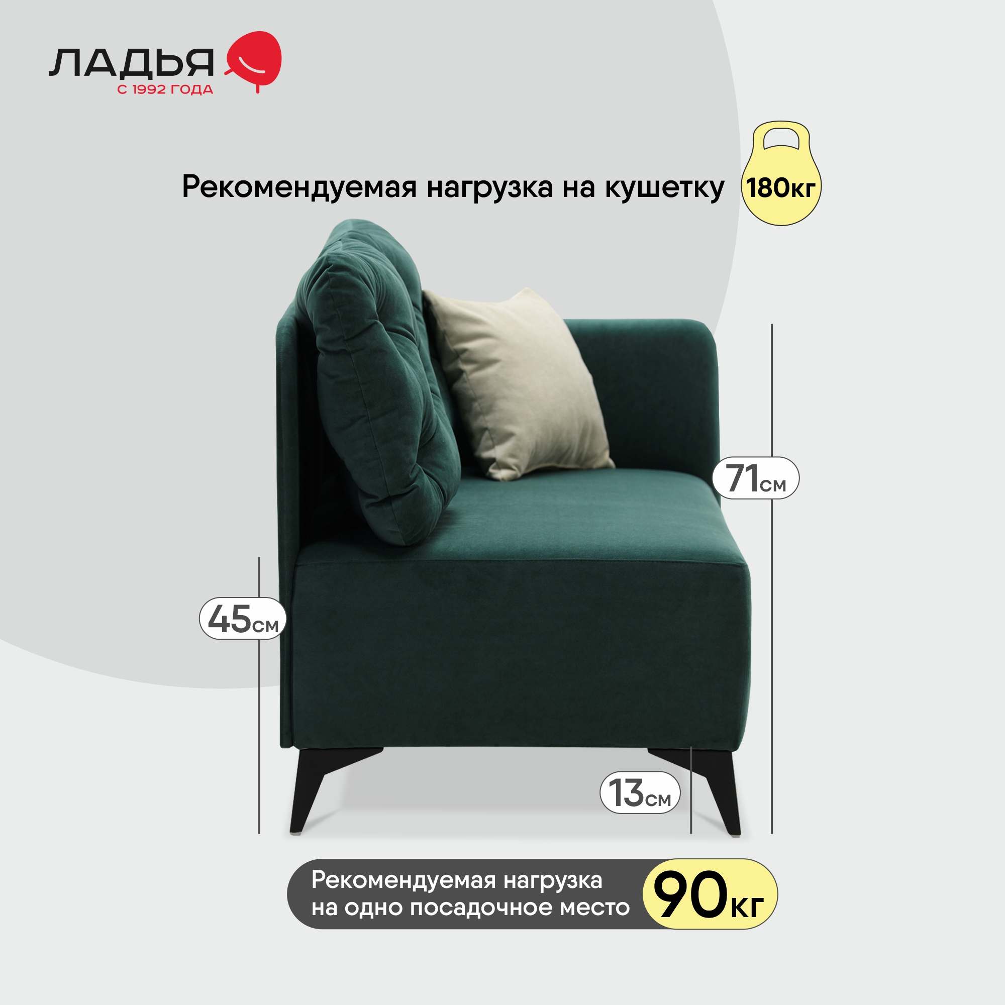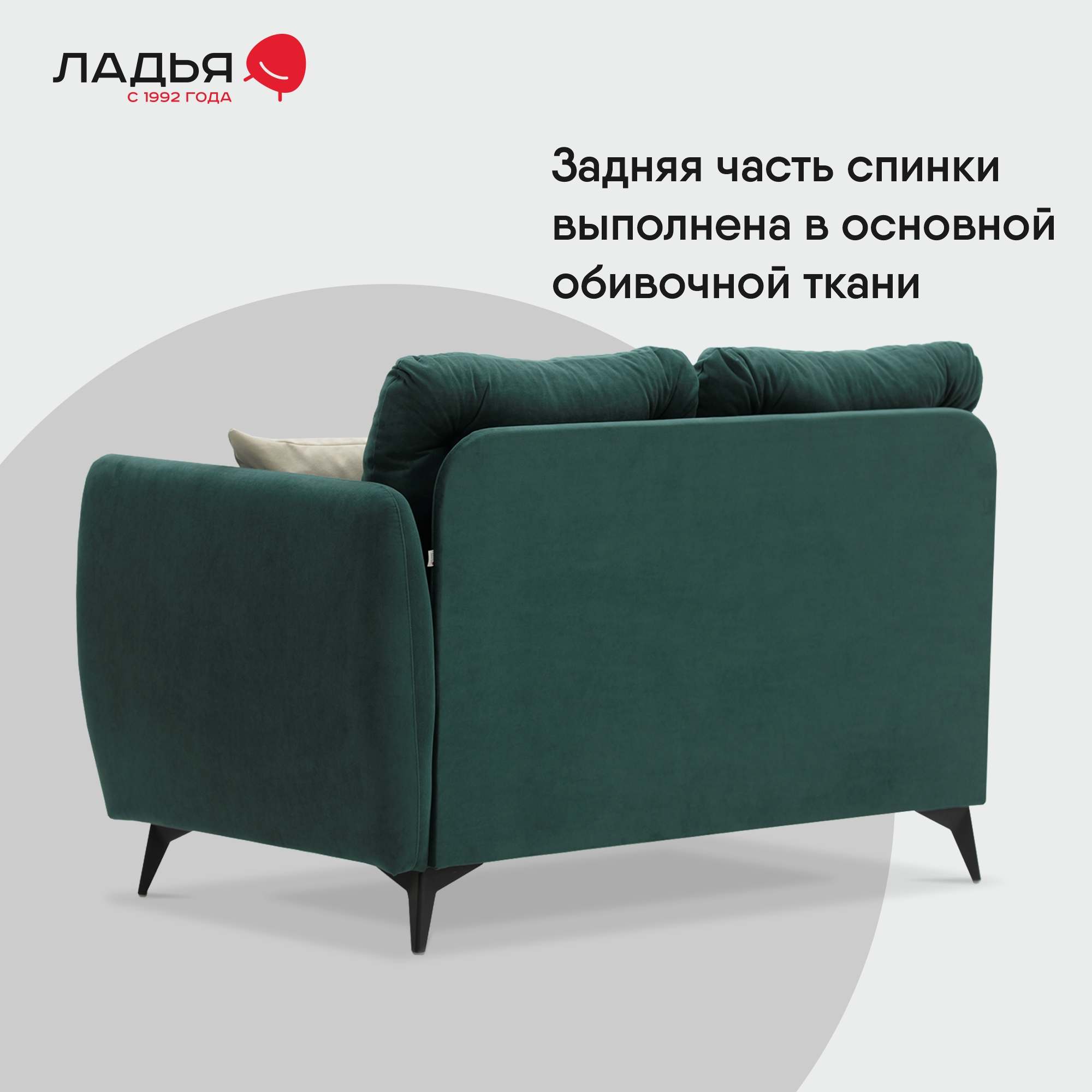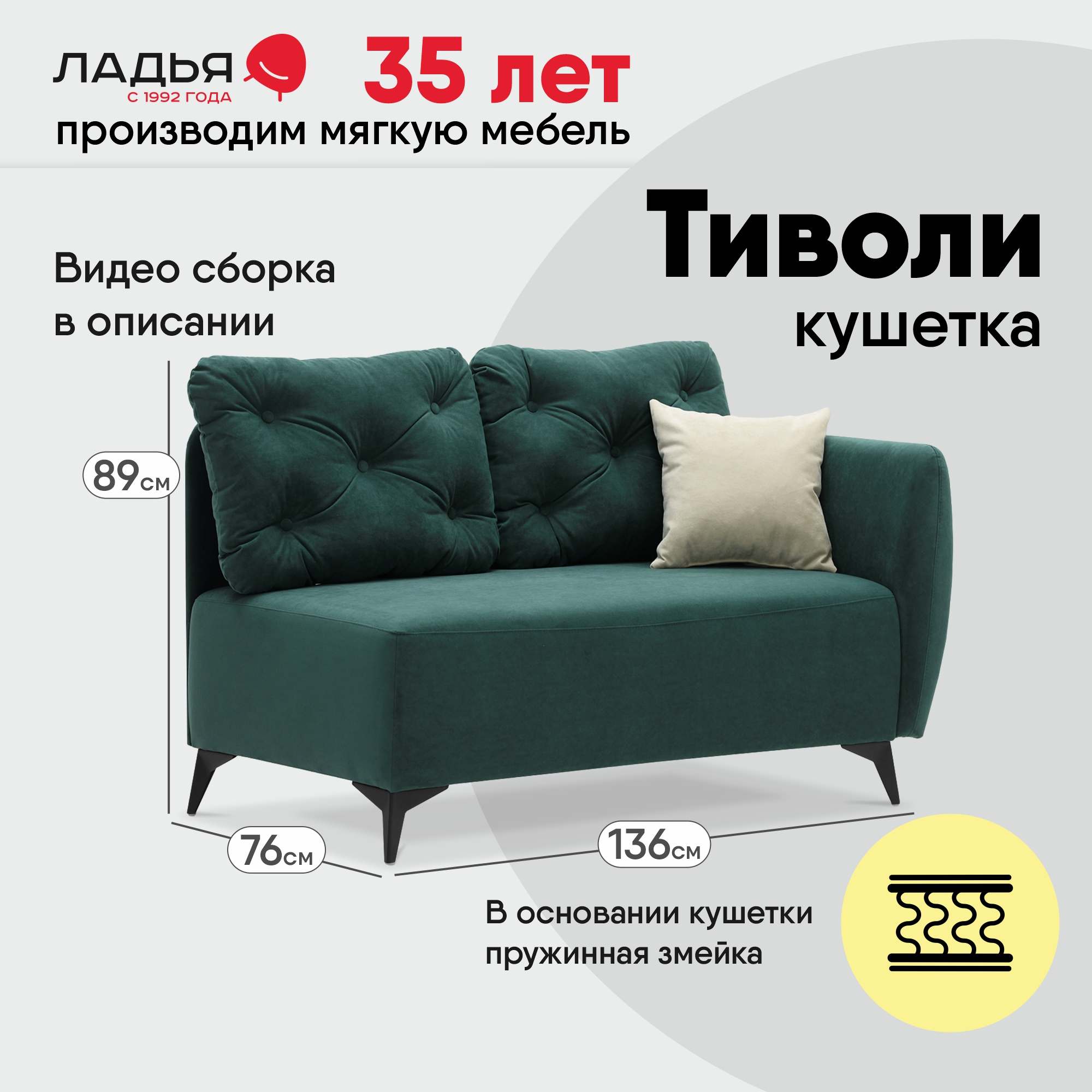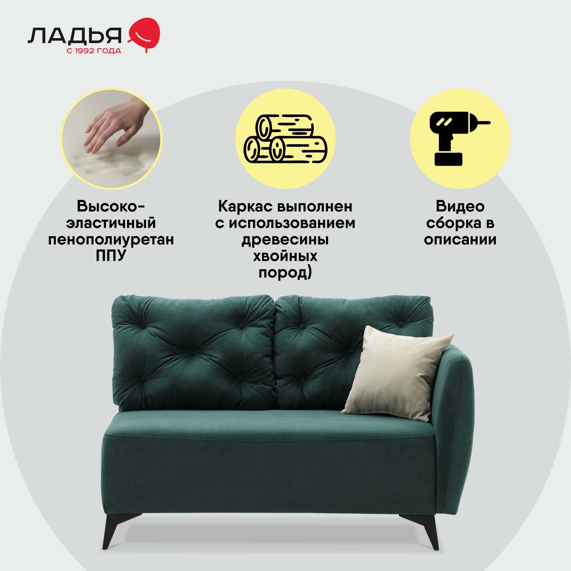 Сиденье сформировано с применением пружинной змейки, высокоэластичного пенополиуретана. Наполнитель декоративных подушек – смесь 85/15 (синтепух/ крошка ППУ).